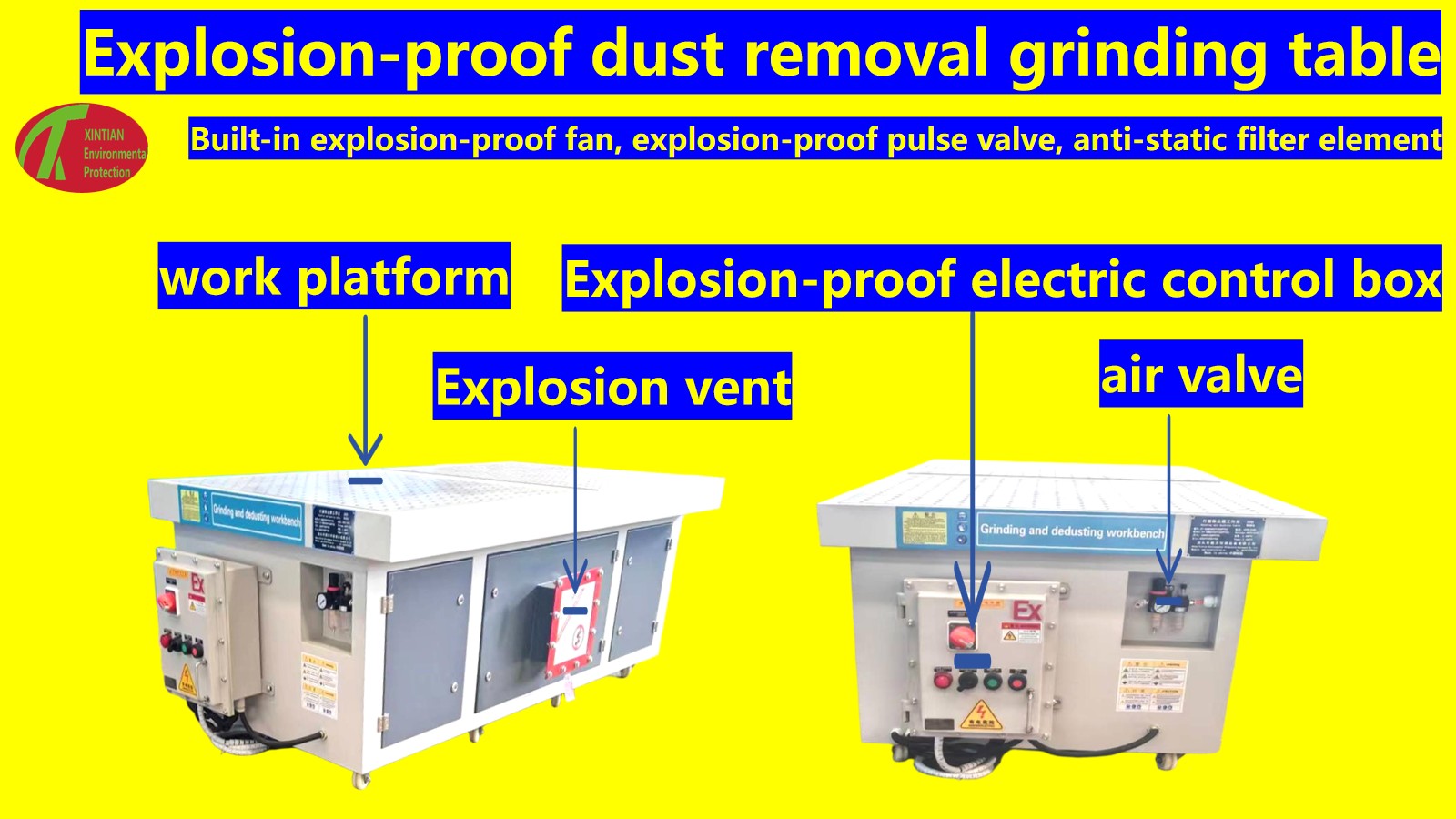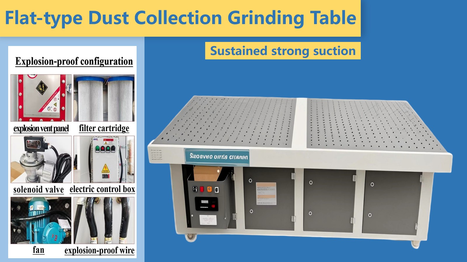 Καλό αποτέλεσμα συλλογής σκόνης: Το επίπεδο και η πλευρά του επίπεδου τραπεζιού λείανσης σκόνης είναι εξοπλισμένα με θύρες αναρρόφησης, οι οποίες μπορούν να αφαιρέσουν τη σκόνη από πολλές κατευθύνσεις και να βελτιώσουν την αποτελεσματικότητα συλλογής σκόνης.